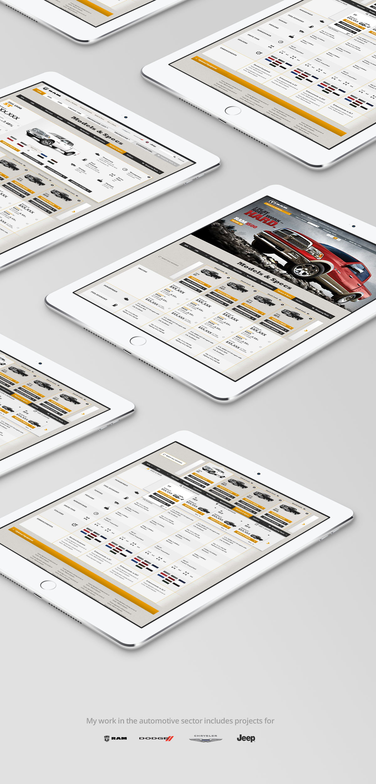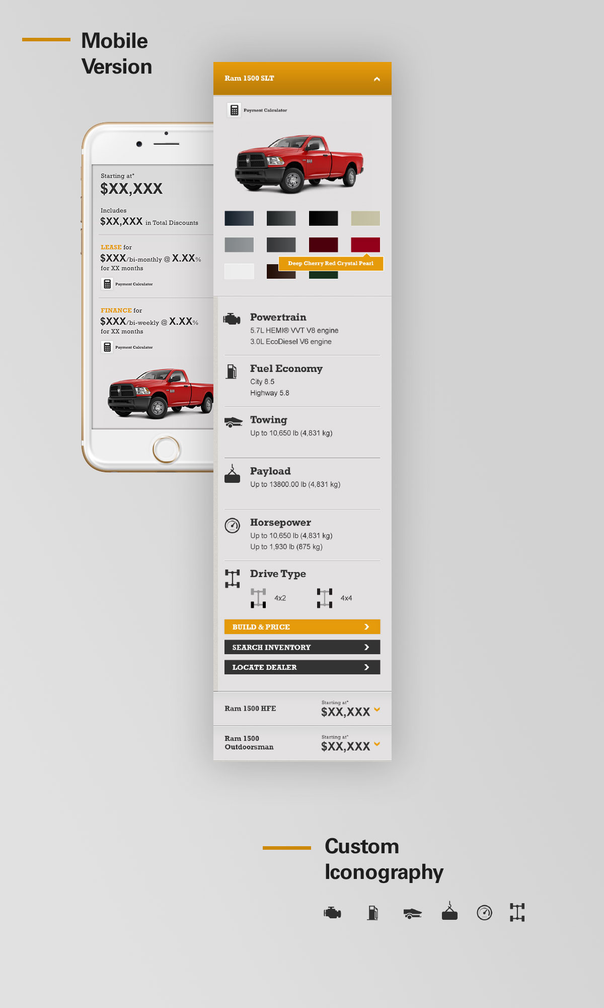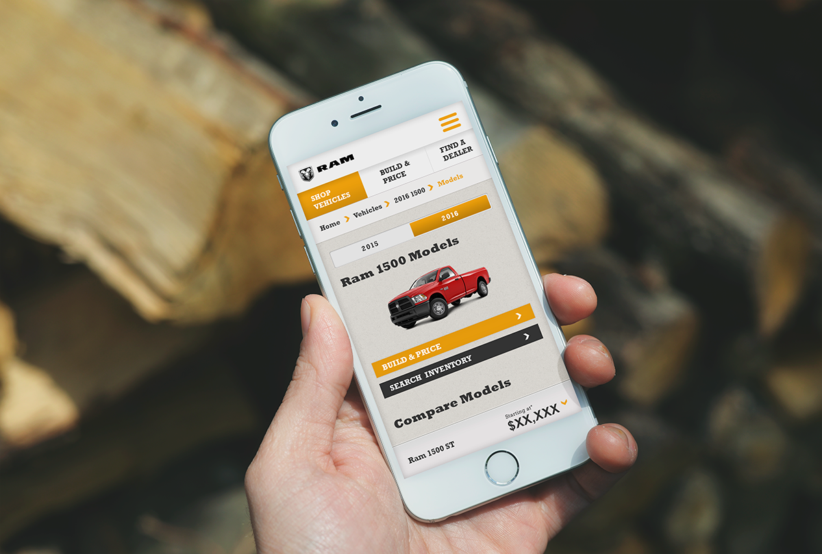 Challenge: Create an easy to use comparison tool for Ram truck models that can present a wealth of information while maintaining an effortless user experience. I used different layout sketches to find the best way to display the information in the wireframes for both desktop and mobile versions. Custom iconography was sourced to create easily identifiable visual cues for the user.