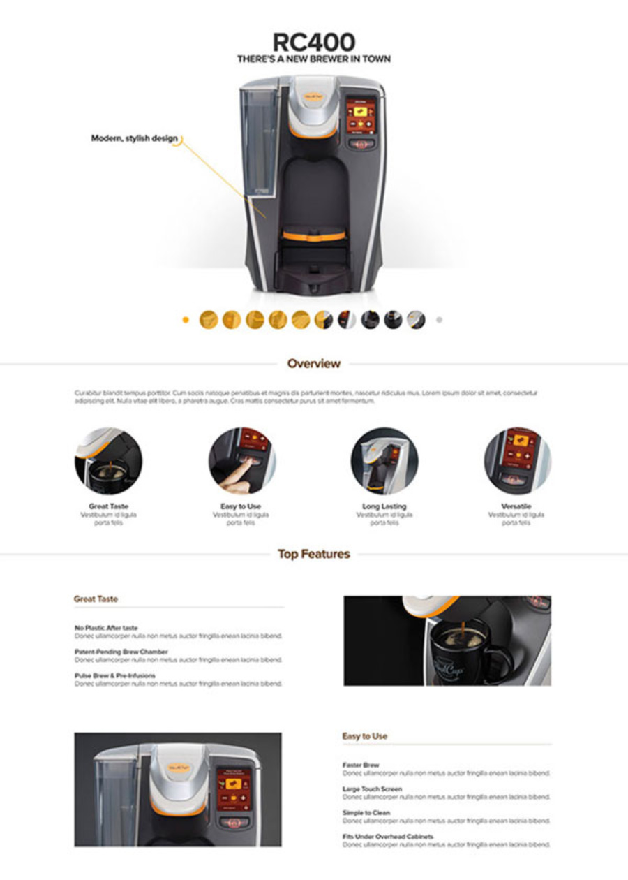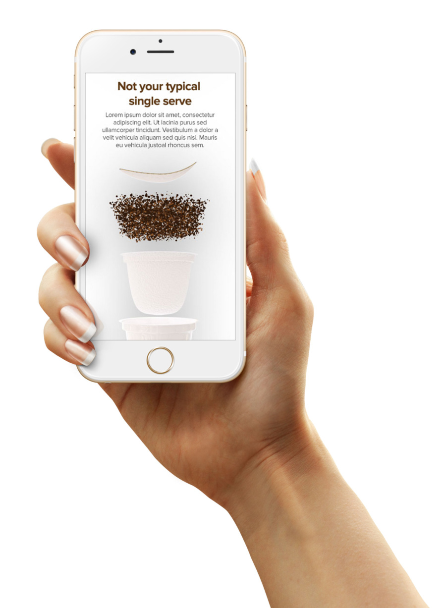Challenge: Demonstrate the ease of using RealCup™ Coffee Capsules in desktop and mobile formats. A parallax effect was used combined with an interactive animation of RealCup™ Coffee Capsules in action as the user scrolls through the site.