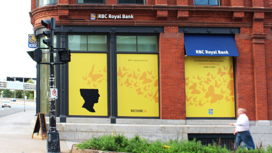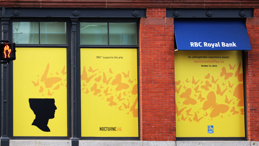 Challenge: Create a display that would stand out to foot traffic despite being seperated by pillars across three window panes. I felt that the best approach was to design artwork that would ‘float’ across all three window panels to create a cohesive display that felt big despite the limitations placed on the creative due to architecture. Nocturne Art at Night is a fall festival that brings art and energy to the streets of Halifax, Canada.